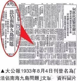 1933年,越南的宗主国法国强占了南沙太平岛等9岛,是为“法国占领九小岛事件”。当时在天津出版的大公报在事件发生后,迅速发表系列社评和文章,抗议法占南海九岛,并反对日本向法声索此九岛主权。