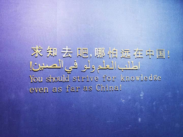 接着,师生们还参观了“阿拉伯—波斯人在泉州陈列馆”、“泉州宗教石刻馆”、“泉州民俗文化陈列馆”等展馆。在“阿拉伯—波斯人在泉州陈列馆”中,用中文、英语、阿拉伯语三种语言书写的标语“求知去吧,哪怕远在中国!”引起了师生们的共和热烈讨论,大家都被这种蓬勃的求知欲所感染。