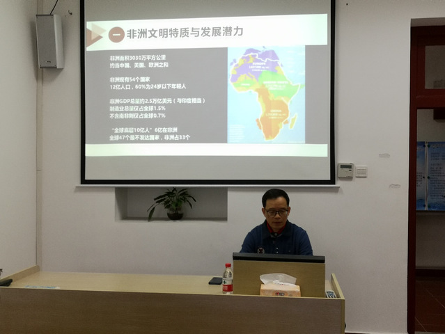 在非洲文明特质与发展潜力方面,刘鸿武教授从非洲的地理环境,如漫长的海岸线和尼罗河等;经济发展,如GDP总量,制造业占全球总量等一系列经济发展数据等;丰富的资源,如化石燃料与矿产资源等;古老的文明,如非洲的部落艺术和民族种族的多元化等各个方面介绍了非洲的独特文明特质和巨大的发展潜力。