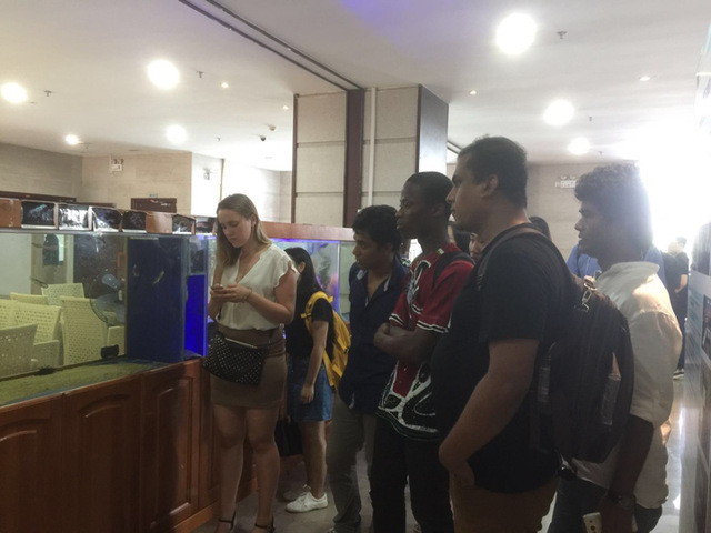 Emily女士还带领学员们先后参观了海洋底栖生物实验室、潮间带生理生态学实验室、海洋碳循环实验室、海洋鱼类生物学实验室等,期间还向学员们展示了海龟、小丑鱼、水母等一系列海洋生物,充分调动了学员们的兴趣。学员们在参观的同时,进行了积极的提问和交流,气氛欢乐活跃。