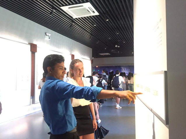 文化的互动与碰撞激发了更多的好奇与求知欲,在热烈的讨论中来到“阿拉伯—波斯人在泉州陈列馆”。刚进展厅,由三种语言书写的标语“求知去吧,哪怕远在中国”跃入观者眼前。来自澳大利亚的Jo手指标语合影留念。古时中国海运商船运载陶瓷、丝绸、踏遍海丝沿线国家,而穆斯林商人则携带香料和珠宝航行至中国各个港口,尤其喜爱当时中国最大对外贸易港——刺桐港(泉州港)。这个场馆展示了大量古时在中国经商的伊斯兰信徒墓碑。访问学者与同学们一一看过简短的墓志铭后发出感慨:“他们在这里生活死亡埋葬,同样也把求知的信仰,异域的文化留在了这里”。