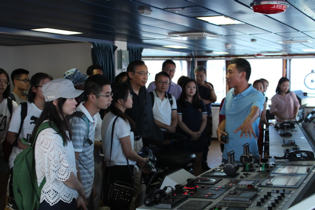 一下车,我校海洋与地球学院副院长、科考船项目技术总负责人、国家近海海洋环境科学重点实验室副主任王海黎与船长尹龙就热情地带领学员们参观了操控室,向学员们介绍船的结构、控制台,并耐心地解答学员们的疑问。当被问到“该如何开船”时,船长尹龙幽默地说:“船是自动的,在没有情况的时候,开船人员的任务就是瞭望。”操控室内一片欢声笑语。