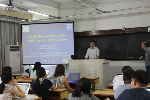 发布时间: 2017-07-20 | 阅读数:2017年7月10-14日,马可·波罗—郑和国际海洋法律与政策暑期班第二周的授课继续在厦门大学南强二309教室进行,厦门大学南海研究院张克宁教授主持了开班仪式。本周的授课嘉宾是来自国家海洋局第三海洋研究所研究员陈建明博士,他毕业于北京大学并获得细胞生物学及遗传学学士、硕士学位,后获瑞士苏黎世大学分子发育生物学博士学位;曾任北京大学生命科学学院助教及讲师、瑞士苏黎世大学博士后、美国Scripps研究所访问学者和厦门大学博士后。