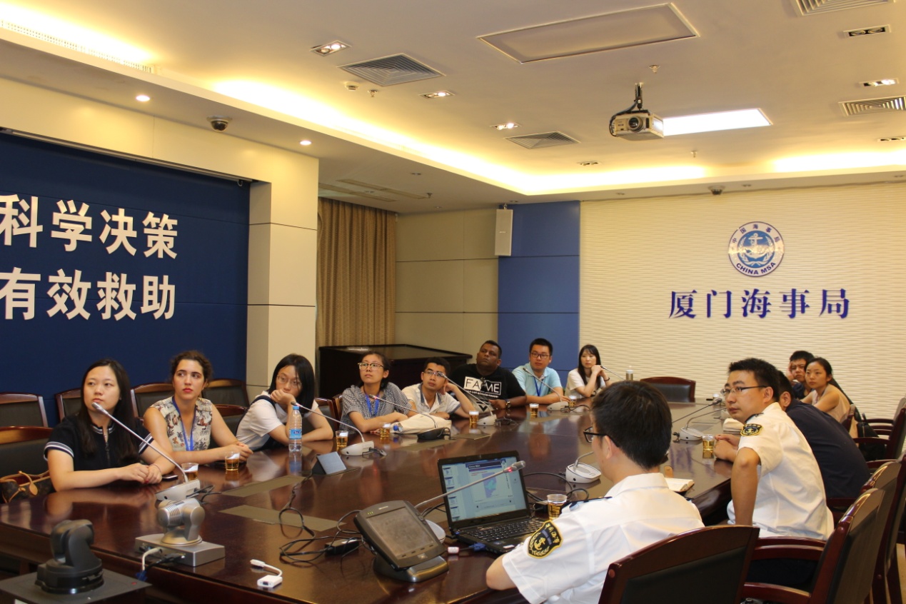 7月13日(周四)下午,暑期班一行来到了厦门海事局交流座谈,海事局派三名资深的船长作为接待人员。船长首先介绍了海事局的管辖范围、工作职责等,接着从海事机构职责、VTS中心简介、团队建设、海事法律法规等多个维度进行讲解。在随后的提问中,斯里兰卡学员Buddica、法国学员Alicia都结合本国海事实践,提出了很多值得思考的问题。学员们通过深入交流,深入了解海上交通事故调查处理和责任认定等方面的知识,并现场参观了VTS值班室。