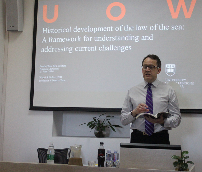 On June 27 Professor Warwick Gullett from University of Wollongong delivered a lecture at the South Chia Seas Institute of Xiamen University. This lecture was hosted by Professor Zhang Kening. Nearly 40 teachers and students, including those from the South China Sea Institute, the Law School and Taiwan Research Institute, attended this lecture.