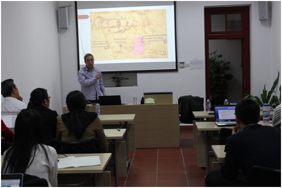 发布时间: 2015-12-08 | 阅读数:2015年12月3号晚上7点,三江学院历史地图中心主任、教授,著名古地图学家许盘清老师在我院进行了题为《南海各岛屿的发现、测量、命名沿革以及所发生的事件》的学术讲座,我院院长傅崐成教授、施余兵副教授及林蓁助理教授以及我院全体同学积极参加了本次讲座。