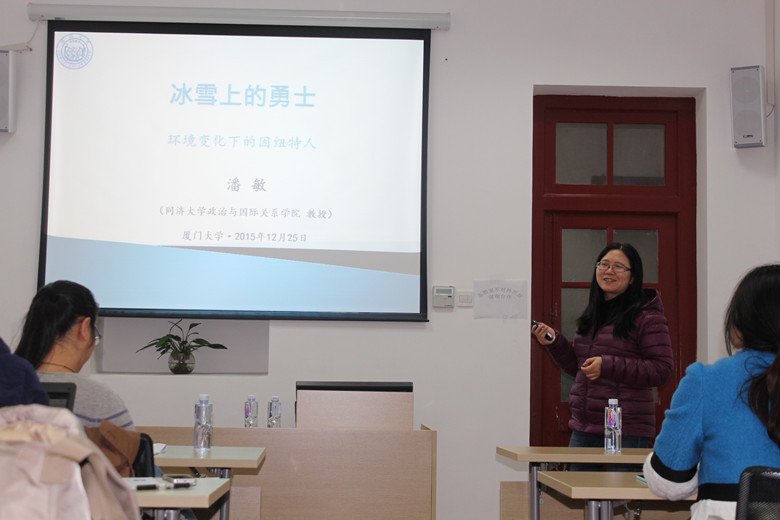 发布时间: 2015-12-28 | 阅读数:2015年12月25日,在愉快的圣诞节,厦门大学南海研究院迎来了同济大学的潘敏教授为广大师生带来一场精彩的讲座。潘敏教授是同济大学政治与国际关系学院教授,2006年8月到12月,在加拿大University of British Colum-bia进修。研究方向为社会史、极地问题。此次的讲座的题目是“冰雪上的勇士:气候变化下的北极因纽特人。”