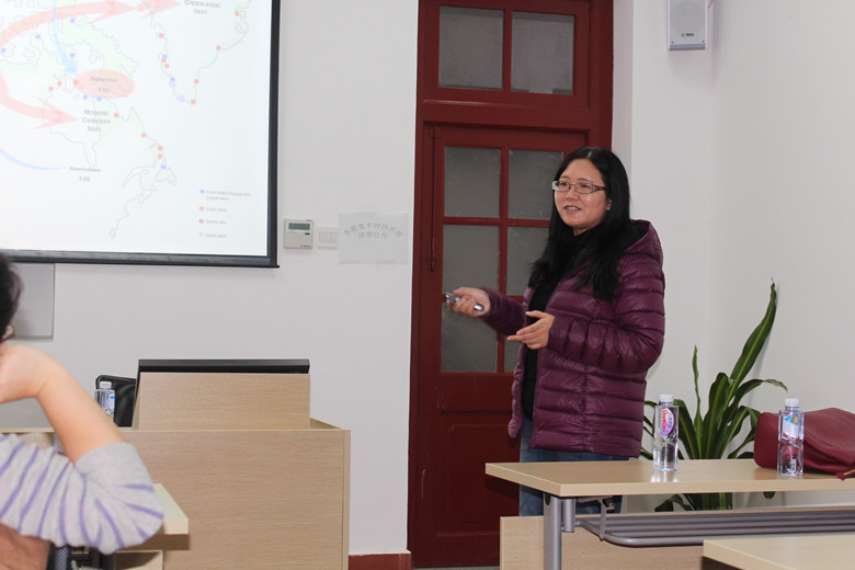 潘教授从介绍因纽特人的基本情况开始,因纽特人又称爱斯基摩(Eskimo)人,生活在北极地区,分布在从西伯利亚、阿拉斯加到格陵兰的北极圈内外,分别居住在格陵兰、美国、加拿大和俄罗斯。属蒙古人种北极类型,先后创制了用拉丁字母和斯拉夫字母拼写的文字。多信万物有灵和萨满教,部分信基督教新教和天主教。住房有石屋、木屋和雪屋,房屋一半陷入地下,门道极低。潘教授称,目前总人口大约二十多万人。讲座过程中潘教授用大量的图片介绍自己的研究,图文并茂,深入浅出,化繁为简,吸引着大家的眼球。