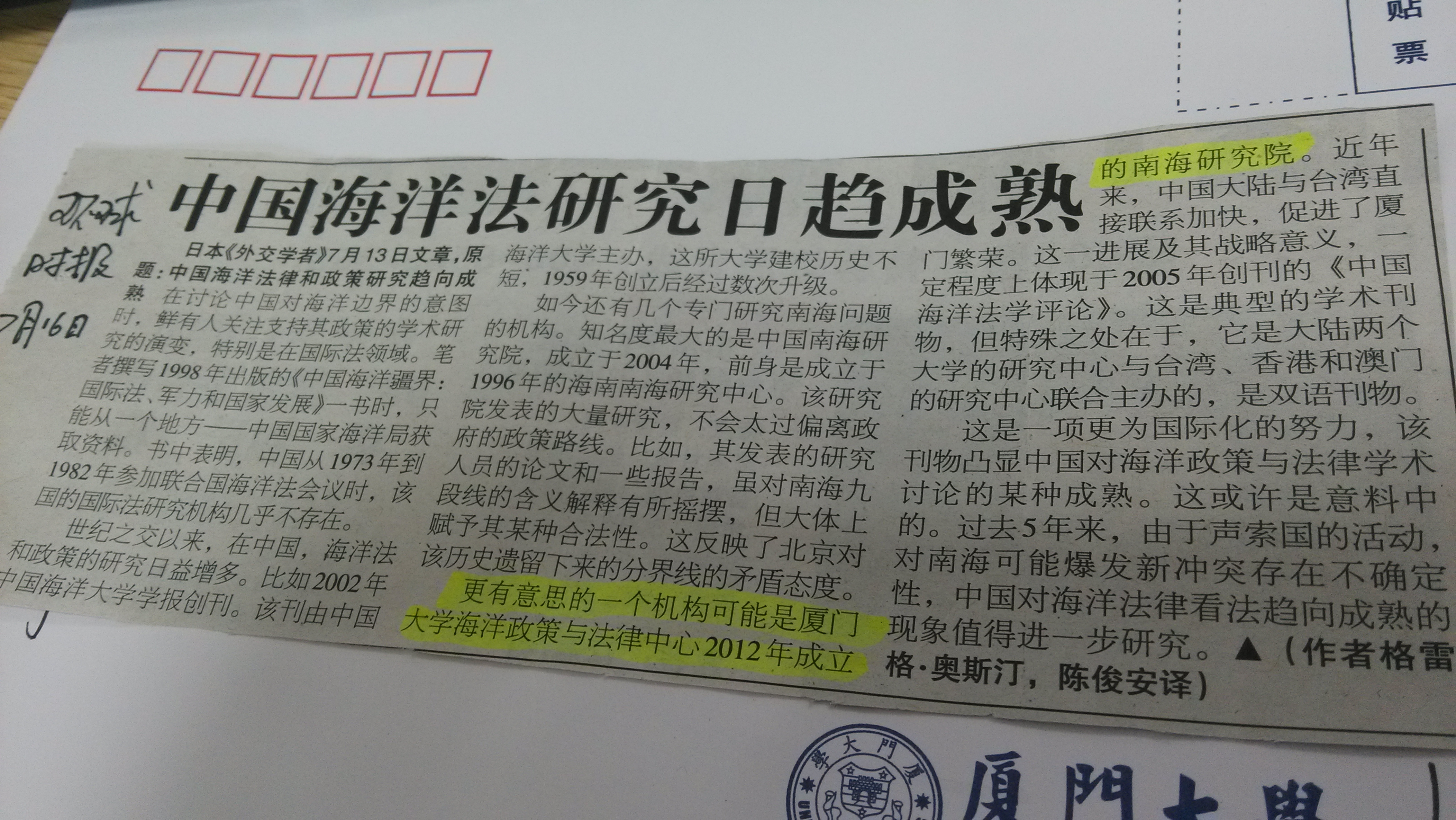 日本《外交学者》7月13日文章,原题:中国海洋法律和政策研究趋向成熟 在讨论中国对海洋边界的意图时,鲜有人关注支持其政策的学术研究的演变,特别是在国际法领域。《环球时报》7月16日撰文《日媒:中国海洋法研究日趋成熟 南海可能爆冲突》,作者格雷格·奥斯汀更是专门对我院进行了介绍。文章称,“更有意思的一个机构可能是厦门大学海洋政策与法律中心2012年成立的南海研究院。近年来,中国大陆与台湾直接联系加快,促进了厦门繁荣。这一进展及其战略意义,一定程度上体现于2005年创刊的《中国海洋法学评论》。这是典型的学术刊物,但特殊之处在于,它是大陆两个大学的研究中心与台湾、香港和澳门的研究中心联合主办的,是双语刊物。这是一项更为国际化的努力,该刊物凸显中国对海洋政策与法律学术讨论的某种成熟。这或许是意料中的。过去5年来,由于声索国的活动,对南海可能爆发新冲突存在不确定性,中国对海洋法律看法趋向成熟的现象值得进一步研究。”