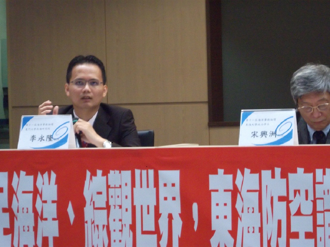 发布时间: 2014-06-07 | 阅读数:我院李永隆助理教授于2014年6月6日参加由台湾东海大学政治学系所主办「第十一届海洋事务论坛:立足海洋、综观世界 东海防空识别区与东亚政经秩序变化」,发表其论文「诡谲多变的南海局势:台湾的应对措施」。在会议中,李永隆助理教授提出现今我国对于东海防空识别区的看法、南海的中越情势发展,以及提出台湾的应对措施建议,引起在场与会者的热烈回响。