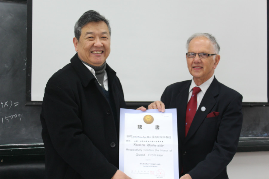 Dr. Vivian Louis Forbes ,现任西澳大利亚大学地球与环境学院教授、马来西亚海洋研究所研究员。多年来从事海洋划界与地图制作等方面的钻研,取得一系列丰硕成果,尤其对南海主权争议及海域划界有深入研究,制作若干颇具价值的海图。本次来厦,Forbes教授为广大师生带来了一场“Understanding Charts and Maps for Maritime Boundary Delimitation”的讲座和题为“The Basic Methods of Drawing Maps and Charts”的报告会,让大家受益匪浅。我院院长傅崐成教授亲自为Forbes教授颁发厦门大学客座教授聘书。