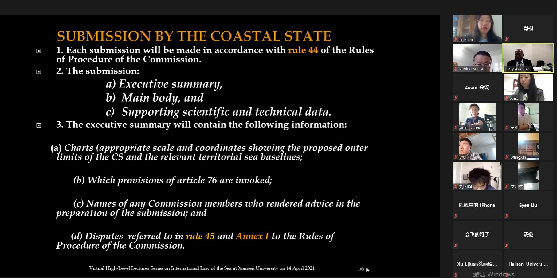在与谈环节,参与的老师和学生与阿沃西卡教授展开积极讨论。内容包括如何确定《公约》第73条中测算大陆架的“定点”,如何解释“未解决(resolved)的海洋划界争端”中“未解决”一词,在墨西哥湾划界案中CLCS对《公约》非缔约方的考量。针对这些内容,阿沃西卡教授做出了详尽解释。本次讲座,阿沃西卡教授系统梳理了CLCS的程序规则和现有实践,内容翔实,专业性强,为线上的师生带来一场“云”上盛宴。