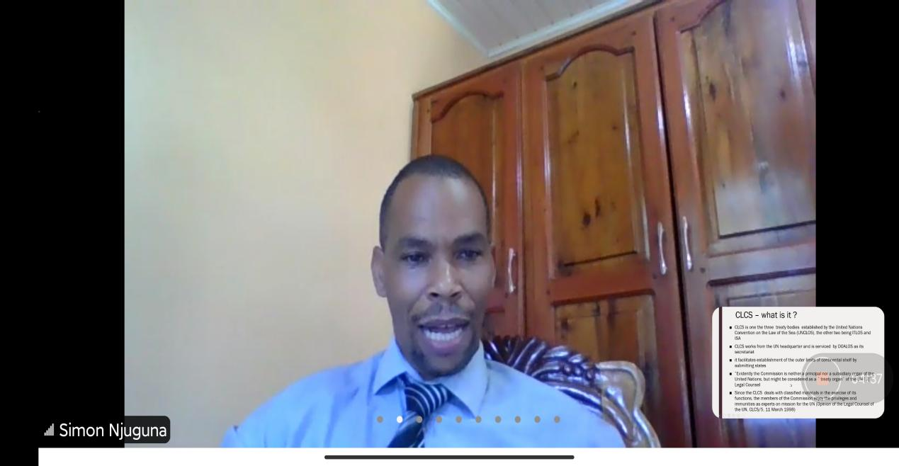 发布时间: 2021-04-22 | 阅读数:2021年4月20日(周二)20:00-21:30,大陆架界限委员会(CLCS)委员兼副主席、肯尼亚国边界办公室海洋司副司长西蒙•恩朱古纳(Simon Njuguna)教授,通过Zoom线上平台为我院师生做了题为“大陆架界限委员会的实践”的讲座,此为2021年厦门大学海洋法高端云讲座系列活动的第三期。本次讲座由厦门大学南海研究院林蓁副教授主持,厦门大学南海研究院徐鹏副教授、钟慧副教授、董世杰助理教授以及国内众多高校的师生共计40余人参与此次线上专题讲座。
