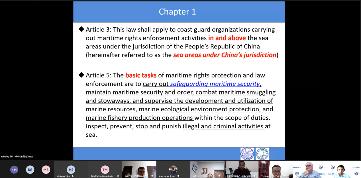 2021年国际海事安全法课程由国际海事组织国际海事法学院主办,邀请了包括来自美国海军战争学院的James Kraska教授和Raul Pedrozo教授、澳大利亚国立大学的Robert McLaughlin教授、联合国国际法委员会Anirudha Rajput委员和前主席Narinder Singh委员、澳大利亚新南威尔士大学Natalie Klein教授、国际海事组织海上安全委员会Julian Garcia先生、日本国防学院Yurika Ishii副教授、国际海洋法法庭Kriangsak Kittichaisaree法官,澳大利亚伍伦贡大学大学Stuart Kaye教授等在内的约20名授课专家,主要面向不同国家的海洋管理部门、执法机构等直接或间接参与海洋安全事务的官员,以及从事海事行业的专业人士。施余兵教授主讲的此次讲座澄清了外界对《中华人民共和国海警法》的一些误解以及错误或不当指责,从中国的视角指出了该法颁布的必要性、合理性与合法性。
