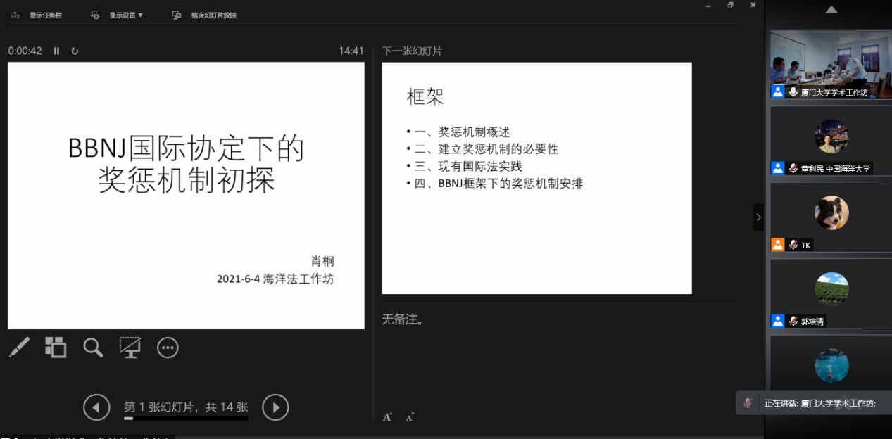 工作坊首先由厦门大学南海研究院2020级博士研究生肖桐作题为“奖惩机制在BBNJ国际协定下的初探”的报告。结合奖惩机制的理论制度及现有实践安排,报告人针对现有的BBNJ协定提出了一些思考建议。三所高校的点评老师从论文的框架结构、概念理论做出了详尽的指导,为文章的修改提出了宝贵建议。