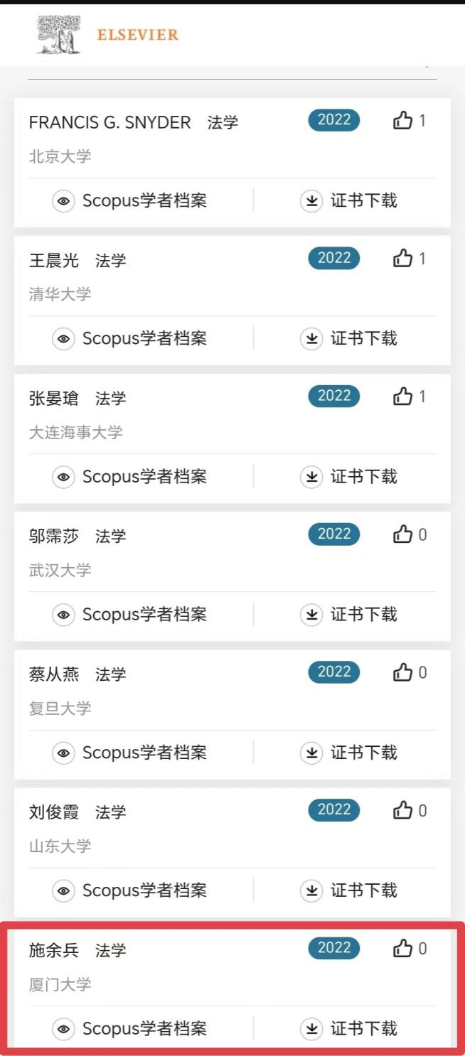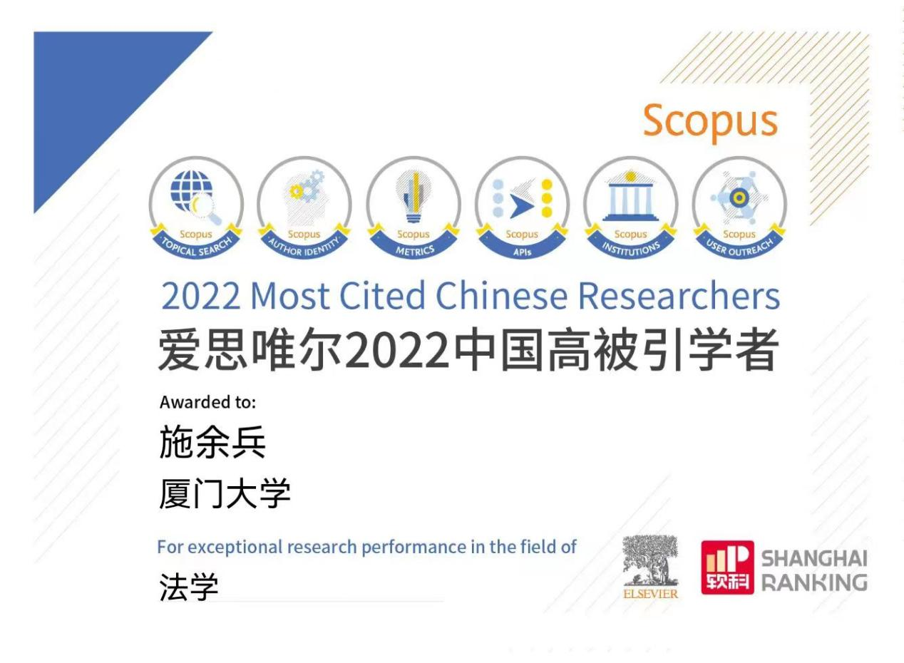 发布时间: 2023-04-06 | 阅读数:3月28日,全球性信息分析公司爱思唯尔(Elsevier)发布了备受瞩目的2022年“中国高被引学者”(Highly Cited Chinese Researchers)榜单。其中,“法学”榜单入围7人,厦门大学南海研究院副院长施余兵教授位列其中。
