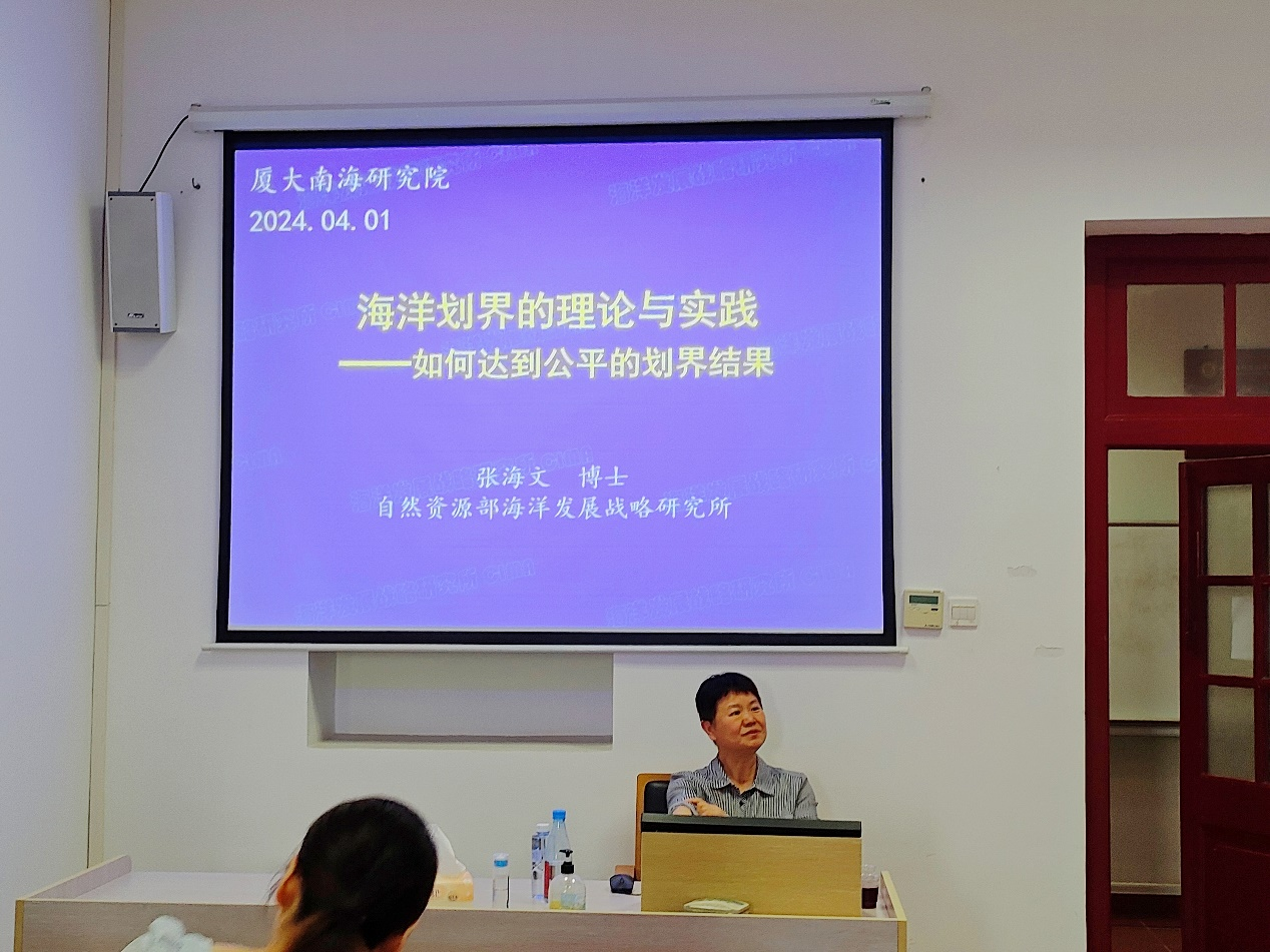 发布时间: 2024-04-07 | 阅读数:2024年4月2日下午3点,厦门大学南海研究院兼职教授、自然资源部海洋发展战略研究所所长张海文研究员为我院师生做了“海洋划界的理论与实践”的专题讲座。本次讲座由厦门大学南海研究院副院长施余兵教授主持,厦门大学法学院海洋和军事国际法研究中心主任陈喜峰副教授、厦门大学南海研究院董世杰助理教授作为与谈人。