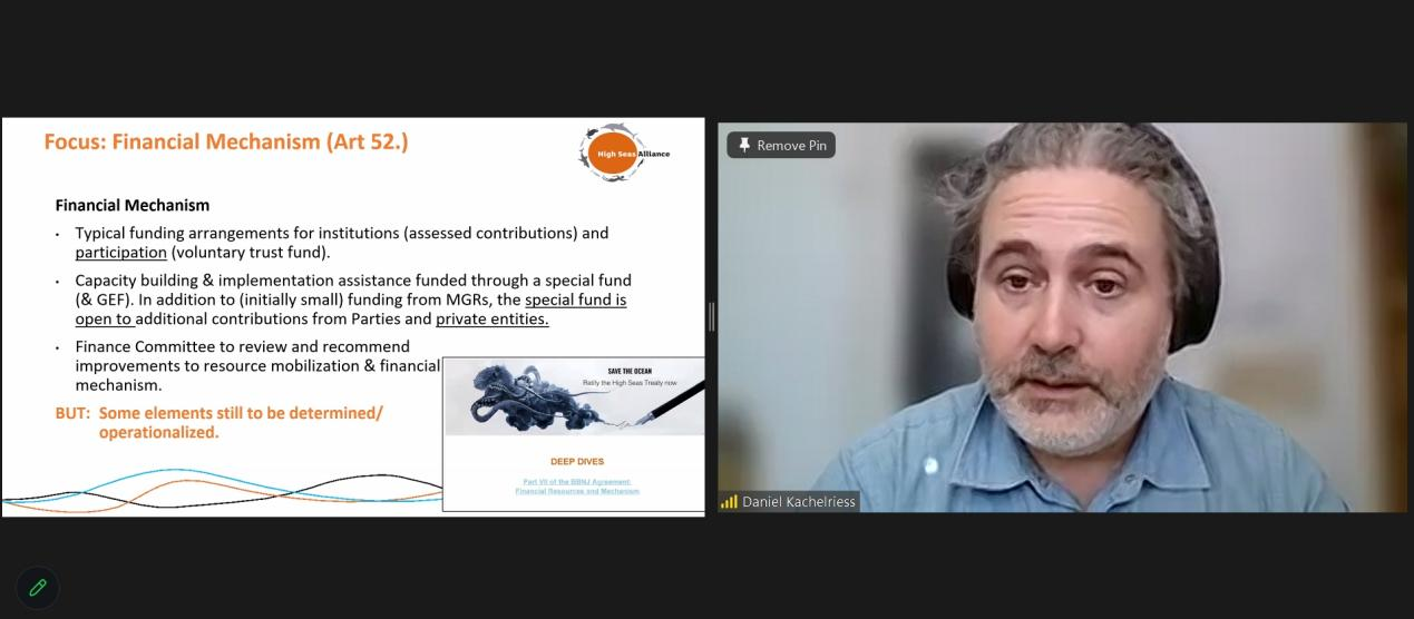 世界自然保护联盟国际环境法委员会成员、公海联盟跨议题问题协调员Daniel Kachelriess博士以“《BBNJ协定》的下一步:为早日生效和运行做准备”为题展开报告。他首先介绍了《BBNJ协定》的制定背景、基本内容以及生效条件。其次,他指出《BBNJ协定》案文中的许多细节特别是主要附属机构的模式尚未确定,并分析了《BBNJ协定》附属机构在准备生效阶段面临的主要问题。最后,他着重分析了财务机制,其认为应由特别基金资助能力建设和实施援助。除了海洋遗传资源提供的(最初数额较小的)资金外,特别基金还接受缔约方和私营实体的额外捐款。