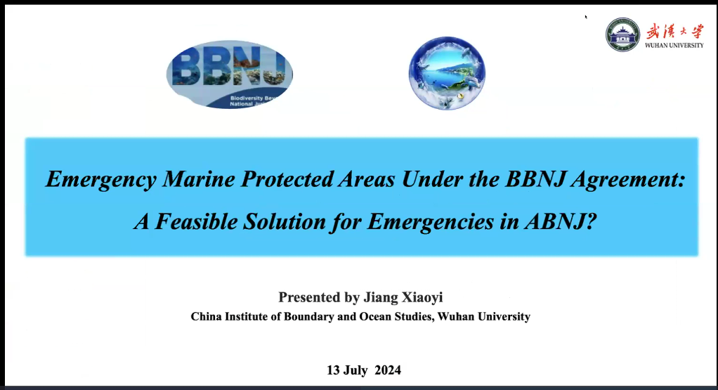 武汉大学蒋小翼教授以“《BBNJ协定》下的紧急海洋保护区”为题展开报告。她认为,在海洋极端事件的发生愈发频繁的背景下,耗时相对较长的常态海洋保护区并非应对紧急事态的理想工具,紧急海洋保护区作为提供临时应急机制的划区管理工具更加有效。然而,现实与理想之间存在鸿沟——虽然《BBNJ协定》为国家管辖范围以外海域实施紧急海洋保护区制度提供可能,但是由于案文表述的模糊、决策生效日期的冗长等现实问题,现有规则无法有效实施紧急海洋保护区制度,有待《BBNJ协定》生效后缔约方大会予以讨论解决。