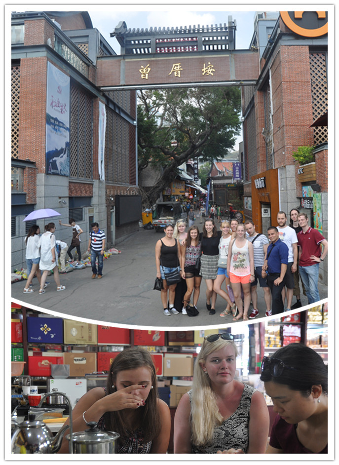 下午,特里尔大学的同学们来到中山路进行游览。他们对于这条厦门著名的商业步行街十分感兴趣,在游览的过程中不停拍照留念,并与随行的志愿者愉快交流。有的同学驻足停留于特色商店,向店员询问商品信息;有的跟随着志愿者体验着闽南特色小吃;还有的则兴致勃勃地来到茶铺。同学们在短短一个下午里品尝到了铁观音、大红袍、碧螺春和普洱茶等中国著名的茶叶。在品茶的过程中,他们还向店长详细了解了这些茶叶的制作工艺,David同学还表示,希望以后能留在中国,一直品味这神奇的“东方饮料”。