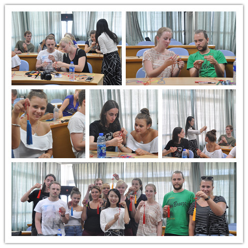 接着,同学们便开始学习中国结的制作。首先,同学们挑战的是双线纽扣结。老师一边用英文一边向同学们演示编制过程。不过,由于步骤略微复杂,同学们纷纷表示没有掌握,于是老师便一对一地进行了讲解和示范。在老师的悉心帮助下,不少同学完成了作品,露出了喜悦之情。同学们尝试的第二种样式是平结,平结需要两个搭档互相帮助,不过编制比较简单,几乎所有的同学都完成了平结的制作。最后一种最难的样式叫吉祥结,需要将绳子摆在桌子上,然后折叠、穿插,非常考验同学们的耐心和毅力。老师在演示了一次后,依旧一对一地进行辅导。每个同学都认真仔细地听从老师的讲解,并且不懈地进行尝试、调整。功夫不负有心人,当看到自己的努力成果时,每个同学脸上都洋溢着自豪的微笑。