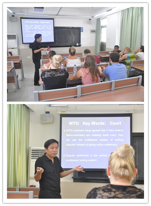 房东老师从劳工保护标准和农业问题角度入手,详细地介绍了贸易往来中会出现的各种法律问题,并介绍了中国与世贸组织的纠纷解决机制。他还特地从版权法中挑出具体法条,来分析中国与外国基于此条会产生的争议。德国学生们积极参与,踊跃提问,整堂课程气氛也相当活跃。