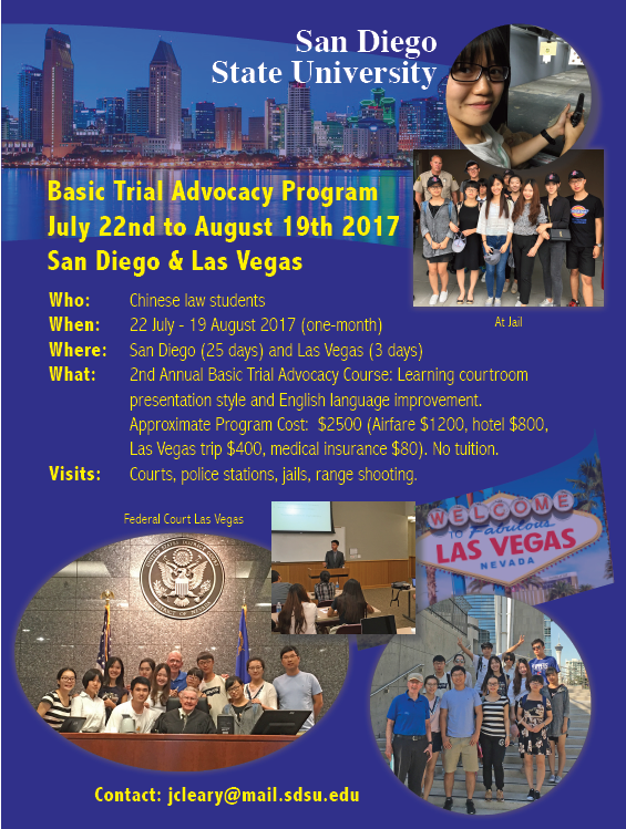 This year San Diego State University (SDSU), as part of its expanding exchange program will conduct a four-week program on Basic Trial Advocacy in English in San Diego, California. The course will consist of at least four class hours each day (three hours on role playing in an advocacy program and one hour of conversational English) five days a week. On each class day the student will perform as either a prosecutor or defense lawyer.