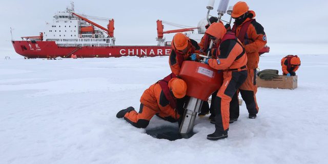 A Chinese research team sets up an ocean profiling float near the icebreaker Xuelong (Snow Dragon), in the Arctic ocean (Image: Alamy)