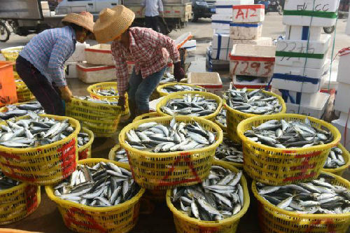 资料图片:海南琼海潭门港的渔民在码头上搬运海产品。新华社发