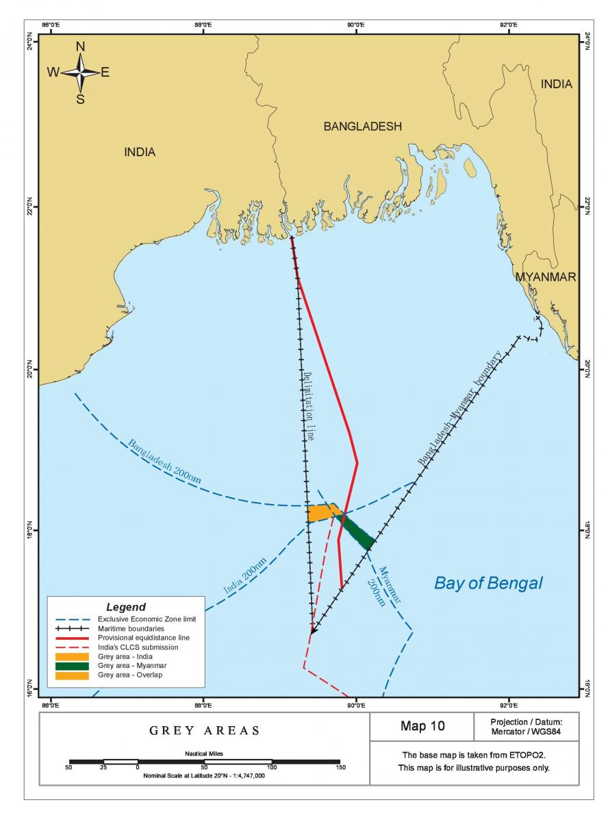 This adjustment of the boundary lead to formation of a “Grey Area”, where the shelf rights, including the seabed and subsoil belong to Bangladesh, but the rights on superjacent waters belong to India.